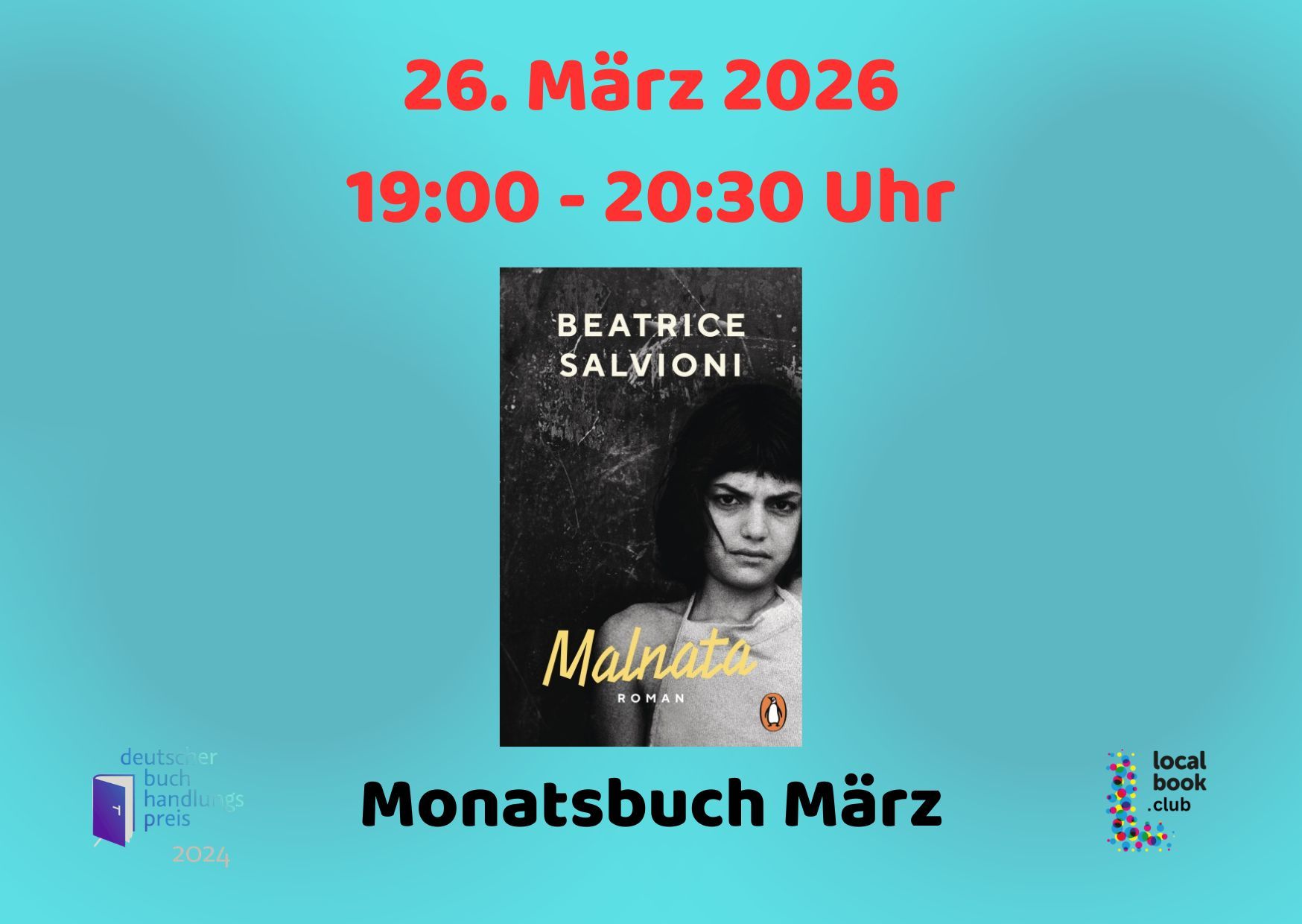 Unser nächster Bookclub findet am Donnerstag, den 26. März um 19 Uhr analog und digital mit unserem neuen Monatsbuch Malnata von Beatrice Salvioni statt.
